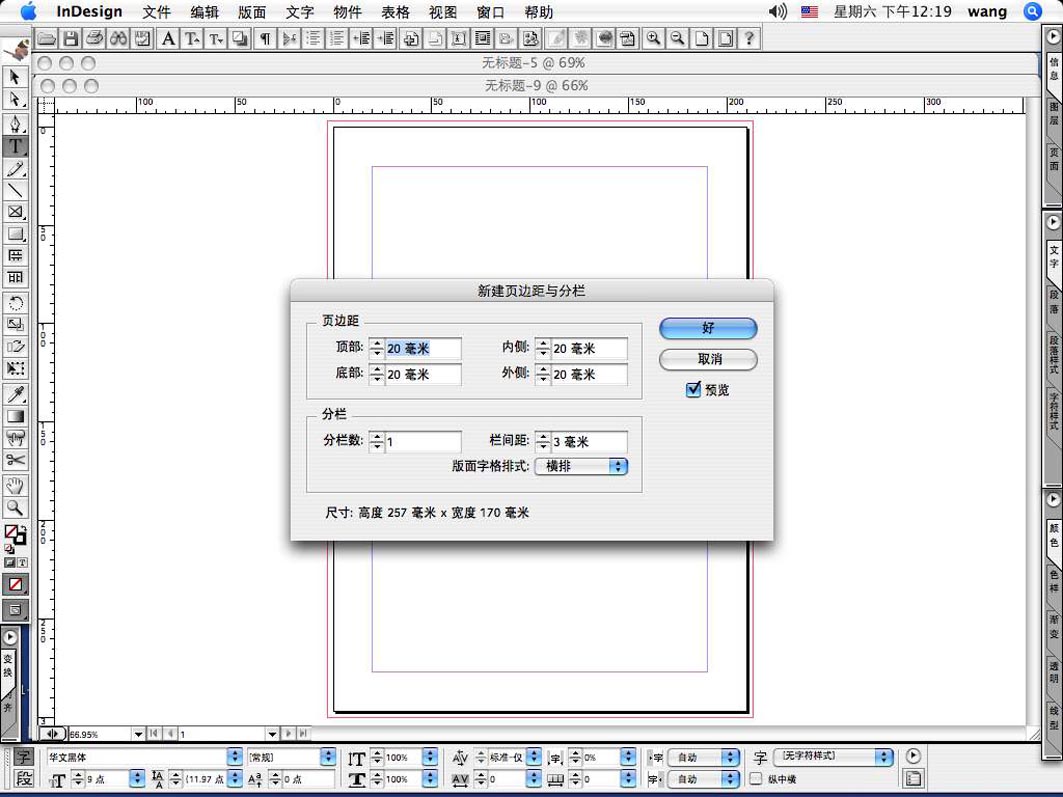 A、开启 彩蝶中文排版工具 或 Indesign cs2 中文版;点击“文件=》新建=》文档”;默认参数,A4幅,点“页边距与分栏”及“好”建立空白页面;千万不要选“版面字格”,否则置入的文字都放在格子中并且可能竖排。(彩蝶中文排版工具和Indesign cs2 中文版菜单提示稍有不同!下边以彩蝶为例来说明)