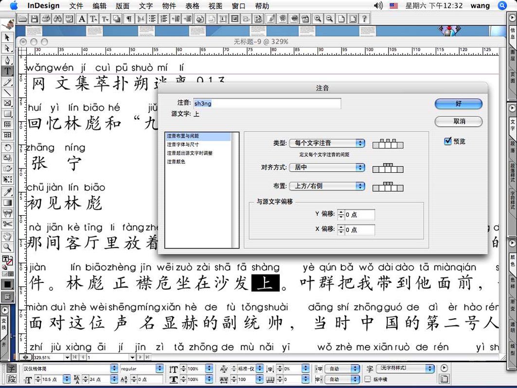 如果改版时,文字改动并且插入的文字内容较多时,建议把要插入的文字用注音软件处理一下,生成 Indd, P65 或 RTF 文档,打开或置入到中文版 Indesign cs2 中,然后再拷贝粘贴到目标文档中;如果是增删个别字,从附近拷贝或刷黑这个字,调出注音菜单,在“注音”处,输入拼音即可,如修改“上”字,如图: