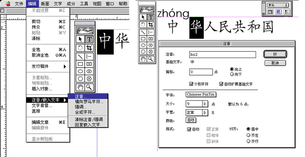 在你的机器中,不管是PC机还是MAC机,必须先安装有种称之为“拼音字体”的西文字体,否则很难排出规范的汉语拼音来,用 Pagemaker6.0&6.5C 与拼音字体 Chinese Pinyin.ttf 或 Pinyin.ttf 配合,使用软件本身提供的“注音”菜单,可以手工给汉字标注汉语拼音,其具体操作方法骤是:使用“T” 文字工具一次刷黑选中一个汉字,然后再点击“编辑==》注音/嵌入文本==>注音”(在 PC 机上 Pagemaker6.0&6.5C 中键盘操作是按 ALT+E+R+R),调出“注音”菜单,利用拼音字体中韵母字母与键盘上数字键和上档键的对应关系输入拼音字符(如:ā=`,á=1,ǎ=2,à=3,ō=4...),例如:要排 zhōnɡ,则在“基础文字:”上的“注音:”栏右边输入 zh4nɡ,再按“好”;然后刷黑选中下一个汉字==>调出注音菜单==>输入字符==>按“好”,再选中下一个字,如此循环往复,一个字一个字地输入标注,如此反复,其效率可想而知,操作见下图所示。