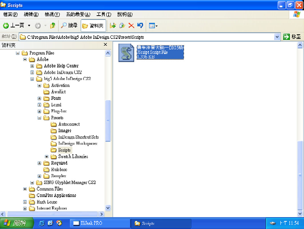 把Indesign cs2、CS3繁体中文版“书生注音大师BIG5版.JSX”拷贝到:C:\Program Files\Adobe\Adobe Indesign CS2\Presets\Scripst\书生注音大师-BIG5版.jsx,如下图所示,但苹果机的路径和PC机的路径稍有差异,都是拷贝到Scripst文件夹中!