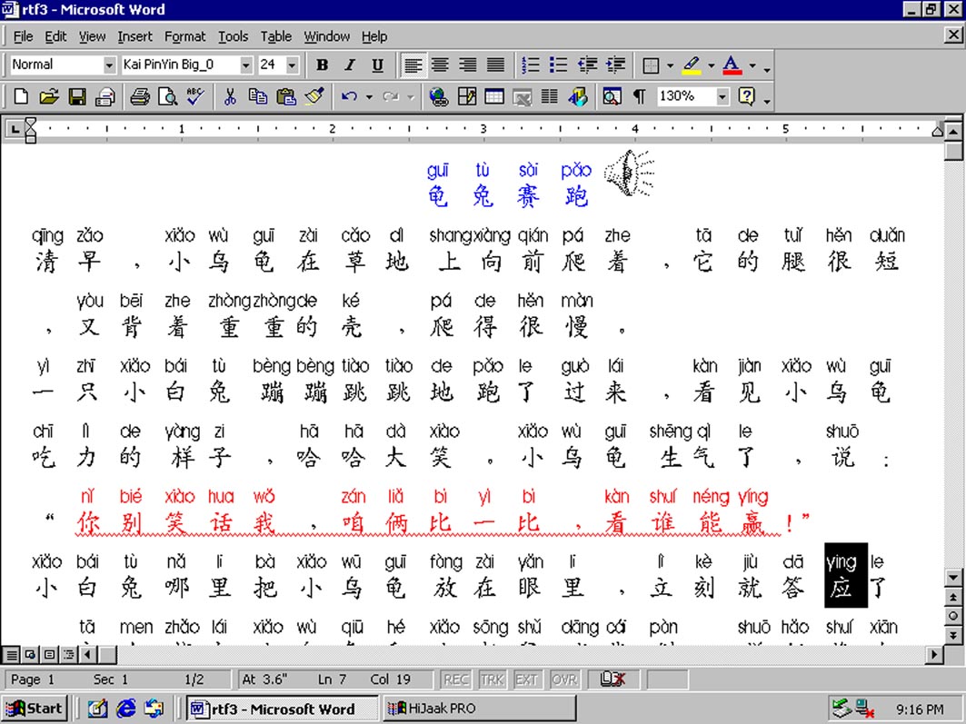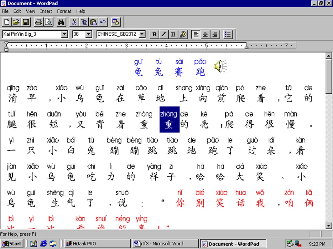 其实你只要在此处(K0,K1,K2,K3,K4,K5,RTF )下载了拼音汉字库及汉语拼音多媒体示例文档RTF,其中包括带有录音的WORD和PDF文档,解压安装拼音汉字库(Kai PinYin Big_0-5)后,也就是把拼音汉字库字体(Kai PinYin Big_0-5)共六个字体文件,拷贝安装到C:\WINNT\FONTS后,即可正常打开、显示、编辑、打印注音读物如《辛巴达历险记》,《曹冲称象》《龟兔赛跑》WORD或PDF等等,而其中的PDF文档,不用安装拼音汉字库,即可用 ADOBE之Acrobat Reader 5.0显示。