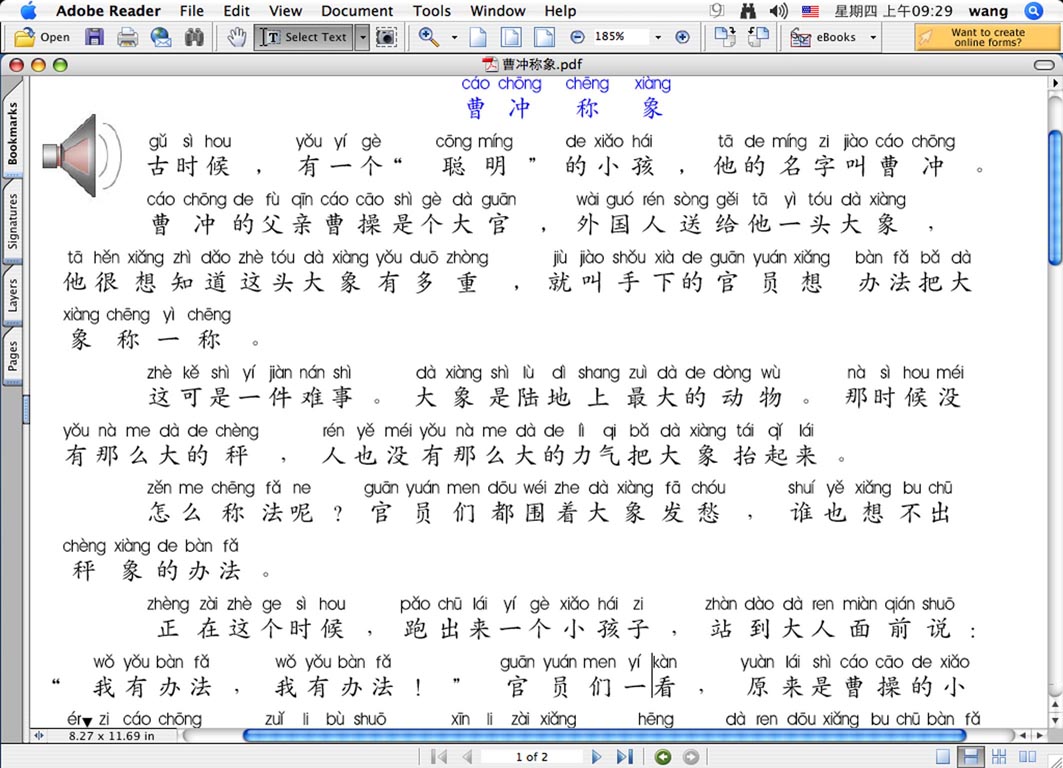 在标音的文档中,你可以插入各种图片,制作成你想要的版式输出即可。你甚至可以插入配音文件,形成具有汉字,拼音,朗读的多媒体DCO或PDF文档。如果在 Indesign cs中,可以插入该汉字的朗读声音文档,然后输出成PDF电子书,那就可以跨平台显示,打印,双击喇叭图标即可朗读《曹冲称象》了,如下图在MAC机上的截屏。