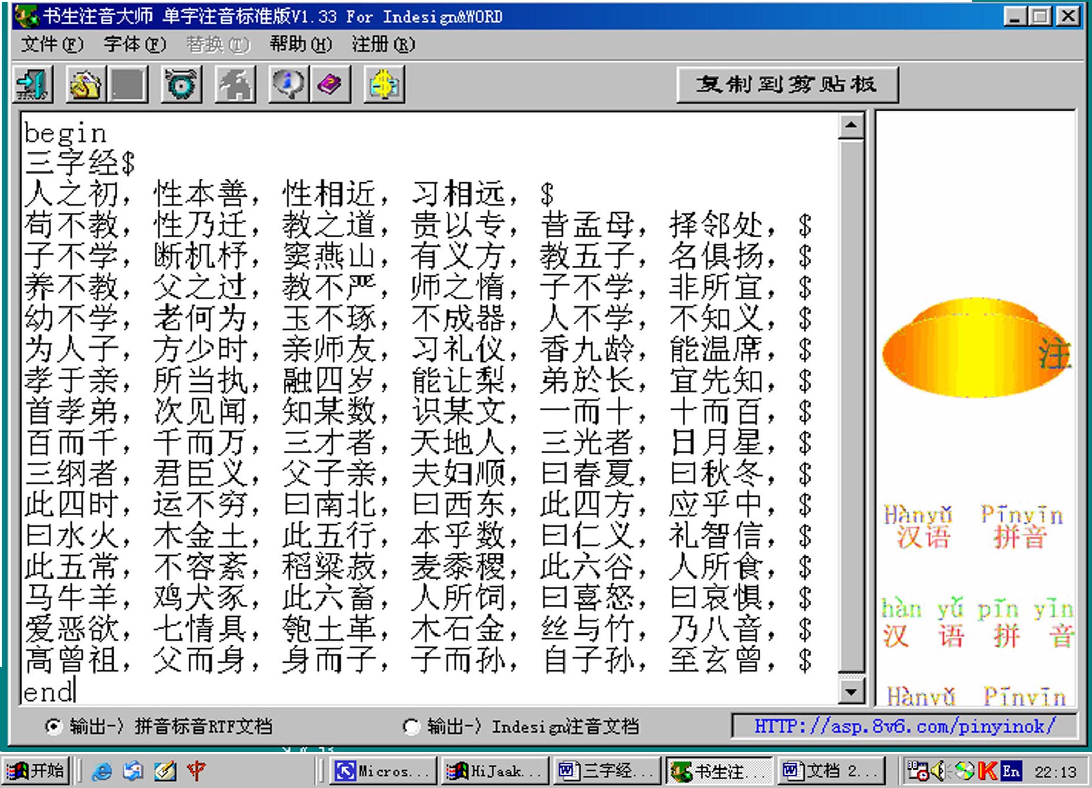 如果想获得准确的汉字标音效果(能区分多音字,轻音字,变音字等),请通过书生注音大师 For WORD&Indesign 把你的汉字文本处理一下,生成标音RTF文档,然后再用写字板或WORD2000&XP打开即可用于显示编辑或打印标音汉字。不过前提是,你必须先下载安装了拼音汉字库。多媒体示例文档见(《辛巴达历险词》、《三字经》、《弟子规》)。